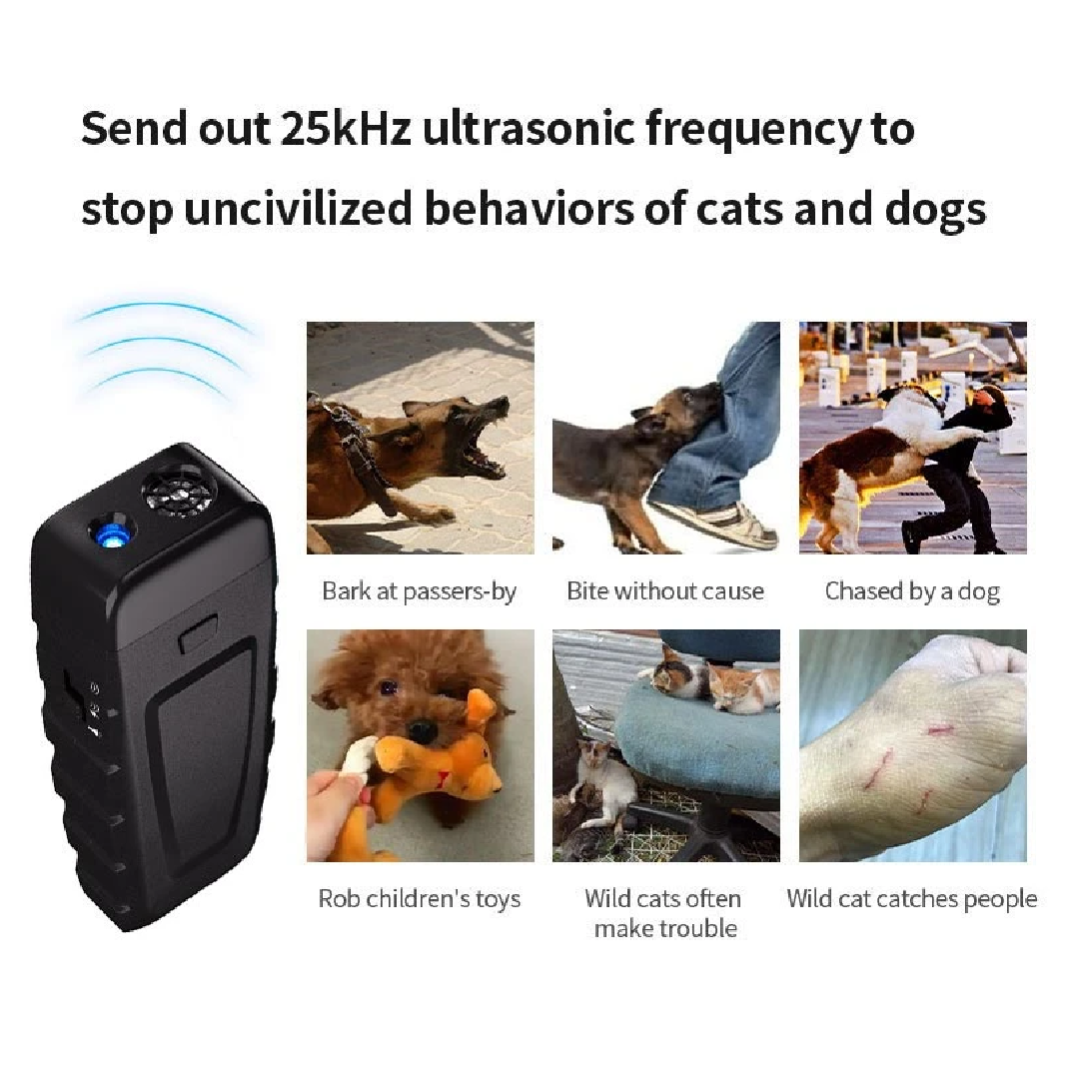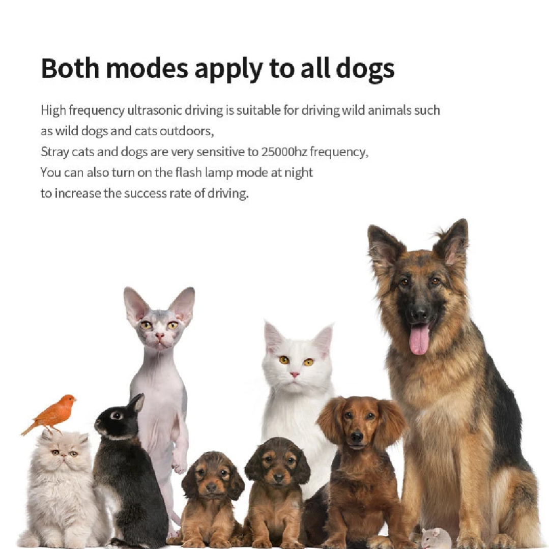 وضعان مع صفارة كلب بالموجات فوق الصوتية بمصباح يدوي لإيقاف النباح، وضع الردع: يصدر صوتًا بالموجات فوق الصوتية عالي الكثافة بينما يومض المصباح لإبعاد الكلب الشرس، وضع التدريب: يصدر صوت بالموجات فوق الصوتية أقل كثافة للمساعدة في تدريب الكلاب اليومي مثل التوقف. النباح المفرط، والقتال، والعض، وتصحيح السلوكيات الأخرى غير المرغوب فيها، يحتوي المصباح أيضًا على وضع طويل ساطع لتمشية كلبك ليلاً.