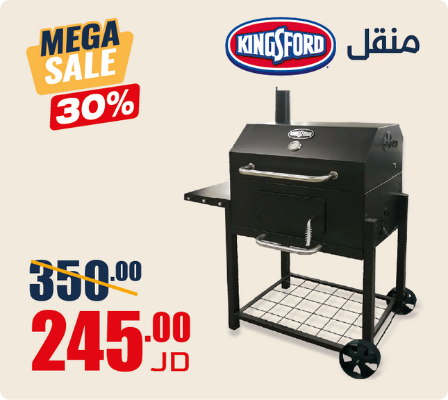 Features porcelain coated steel wire cooking grate, chrome plated warming rack, bottom wire rack for storage. Bottom wire rack for storage. Wheels for easy transportation. Fits 30 burgers. Fits 30 burgers. Porcelain coated steel wire cooking grate. Chrome plated warming rack. Removable ash tray. Foldable side shelf. Thermometer. Front charcoal refill access door. Bottom wire rack for storage. Wheels for easy transportation. Specifications Primary cooking area: 411 sq. in. Secondary cooking area: 182 sq. in. Dimensions: 41.5" x 24.3" x 54.5".