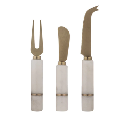 Product Description Emerson, a sense of style and luxury. Made from high quality marble, each piece has been individually hand crafted with elegant gold detailing. The collection features all essential serving pieces in white, black and champagne marble. Whether its entertaining on a Friday night or creating a timeless look for your home, Emerson will be cherished for years to come. Set of 3 Emerson Grazing KnivesThe set includes 1 x Spreader Knife, 1 x Cheese Forkand 1 x Pronged Cheese KnifeMade from Stainless Steel with a Titanium coatingSolid marble handle with brass detailingComes in gift box packagingAvailable in White, Champagne or Black marbleMatches with the rest of the Emerson Marble Serveware collection