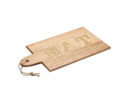 The serving board is made from mango wood, which is a more sustainable option when it comes to picking wood material items for your home. The brass coloured lettering that reads ‘EAT’ adds a beautiful touch to the serving board, and lets your guests know exactly what to do! When it comes to storing away, the serving board has a handy rope loop which can be hung from hooks or hanging racks. Features This serving board combines natural mango wood and brass-look lettering for a dazzling, rustic look Celebrate the joy of dining with its smart 'EAT' motif. Crafted in brass-coloured metal, it creates a stunning contrast with the wood It comes fitted with a rope loop, so it can be hung up for storage, or as a handsome wall decoration Product Dimensions 38 x 20.5 x 1.5 cm; 1.12 Kilograms