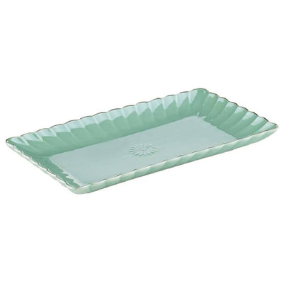 Product Description Complete your afternoon tea collection with the elegant, French tearoom-inspired Ashdene Parisienne Pearl Platter Aquamarine. Pile the Ashdene Parisienne Pearl Platter Aquamarine high with colourful macarons, bursting with delicate, sweet flavour, to accompany freshly brewed tea. This rectangular platter, crafted from beautifully delicate yet resilient new bone china, features an intriguing textural design element of scalloped edges. Finished in turquoise-blue with an iridescent glaze, the platter is framed with metallic gold rims that set alight the luxurious aesthetic. Pair it with a range of complementing pieces from the stunning Parisienne Pear collection, available in a selection of beautiful pastel colours. It's recommended to wash the Ashdene Parisienne Pearl Platter Aquamarine by hand only. Features and Benefits Give your baked goods the opulent backdrop of the Ashdene Parisienne Pearl Platter Aquamarine Chic rectangular platter for everyday enjoyment and tea parties alike Reflects the elegance and style of French tearooms Beautiful, yet durable, high-quality new bone china constructions Each piece features an aesthetically pleasing scalloped pattern Finished in a pearlescent pastel tone with exquisite gold rims A charming box makes for easy gift giving Must be washed by hand only