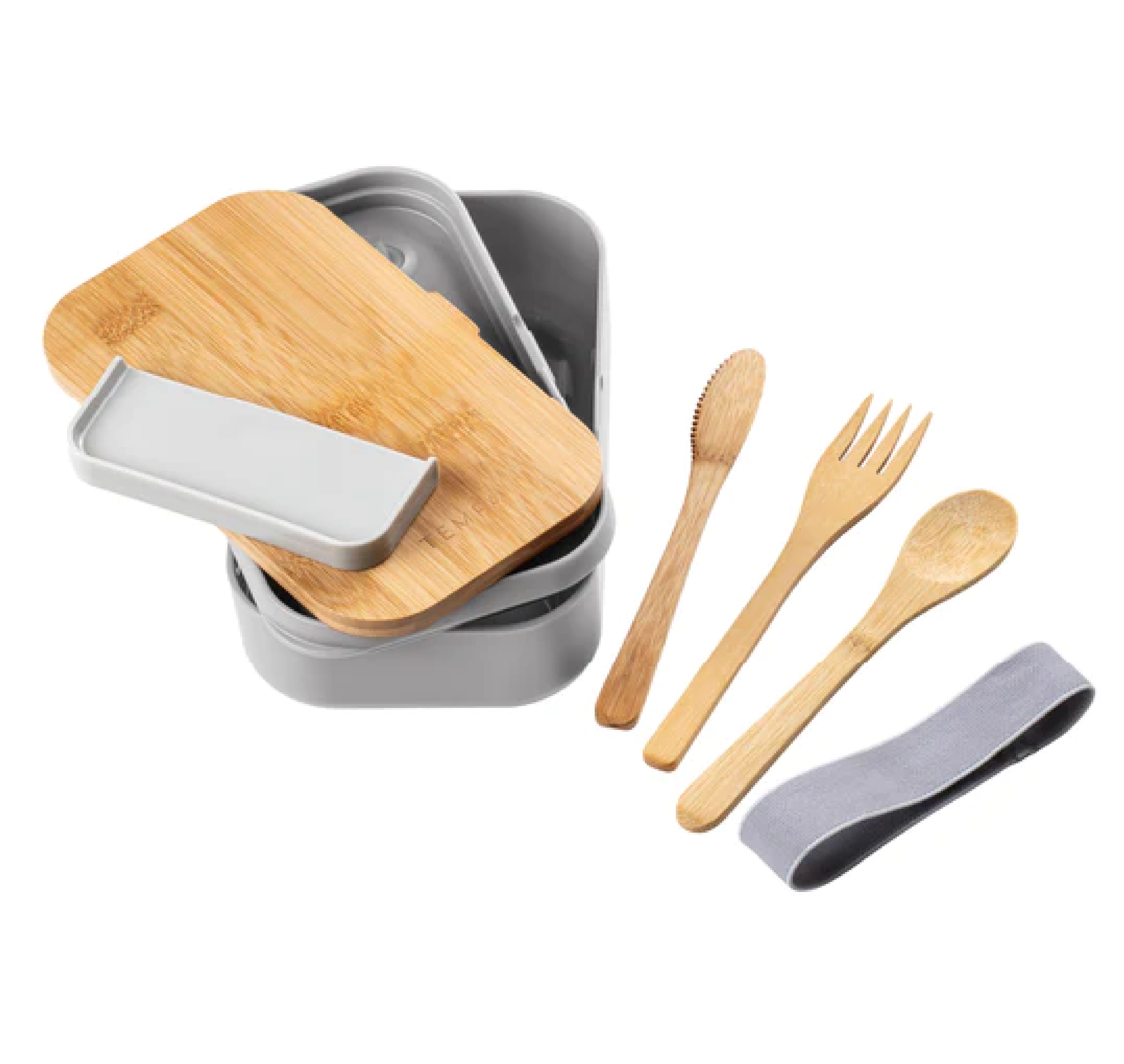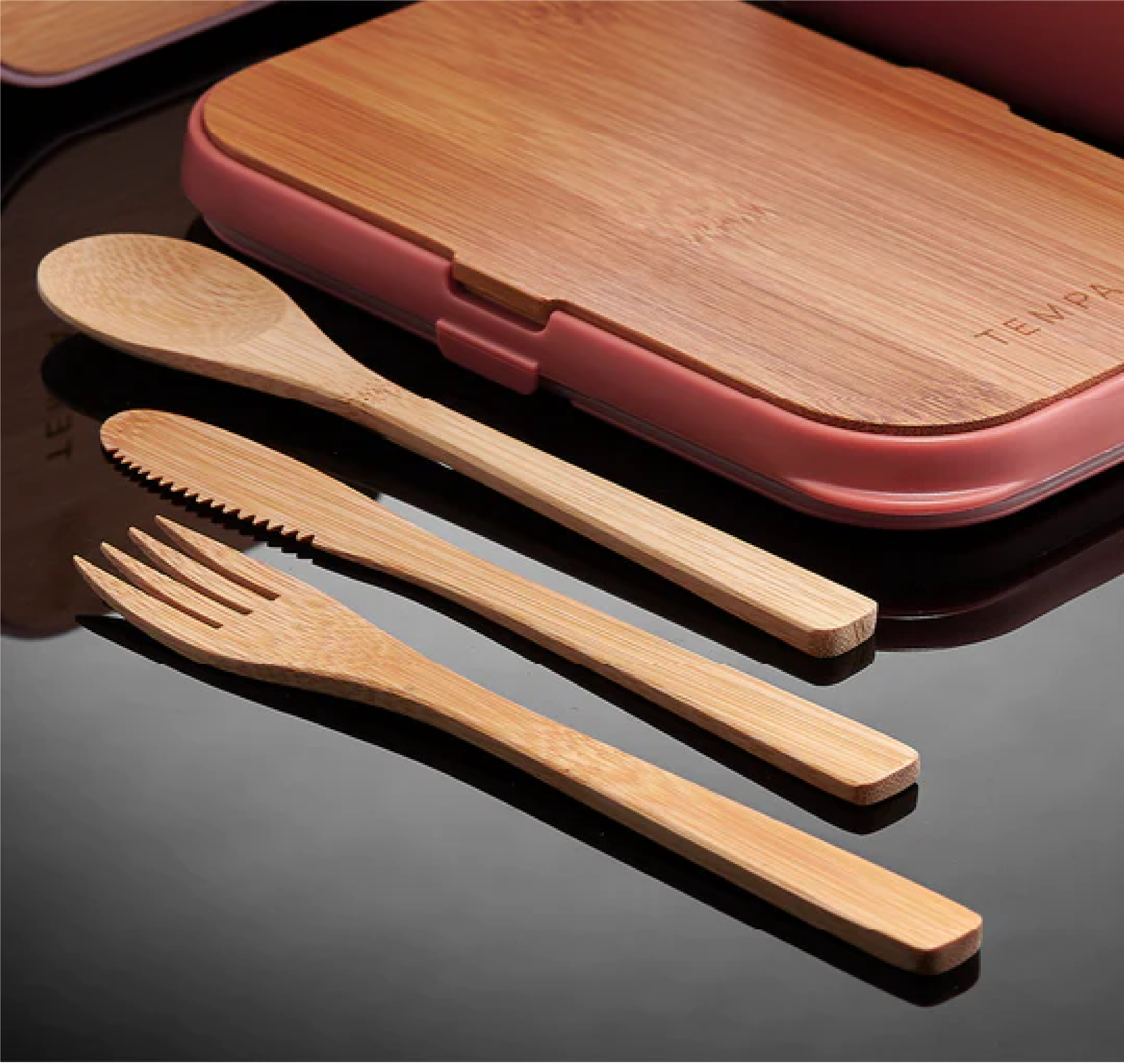 Set includes 1x bento box, Bamboo cutlery set: 1x spoon, 1x fork and 1x knife