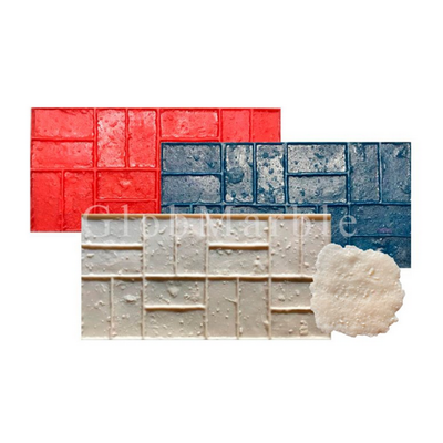 Concrete stamps are used to stamp, imprint and texture newly poured concrete. See these different stamp patterns being stamped into concrete and get tips on how to properly used concrete stamps. Stamped concrete is more popular today than ever before. The main reasons is the availability of better concrete stamp mats and concrete texturing tools that produce very realistic results. Many people can't tell the difference between stamped concrete and pricier paving materials such as natural stone, slate, or brick. Concrete stamps are manufactured in hundreds of different patterns. Stamp patterns include brick, brick border, slate, flagstone, cobblestone, fieldstone, fan stone and many more. Patterns are commonly made to resemble stone yet these rubber stamps can also be made to resemble wood, rock salt finishes, broom finishes, fossils, or leaves.