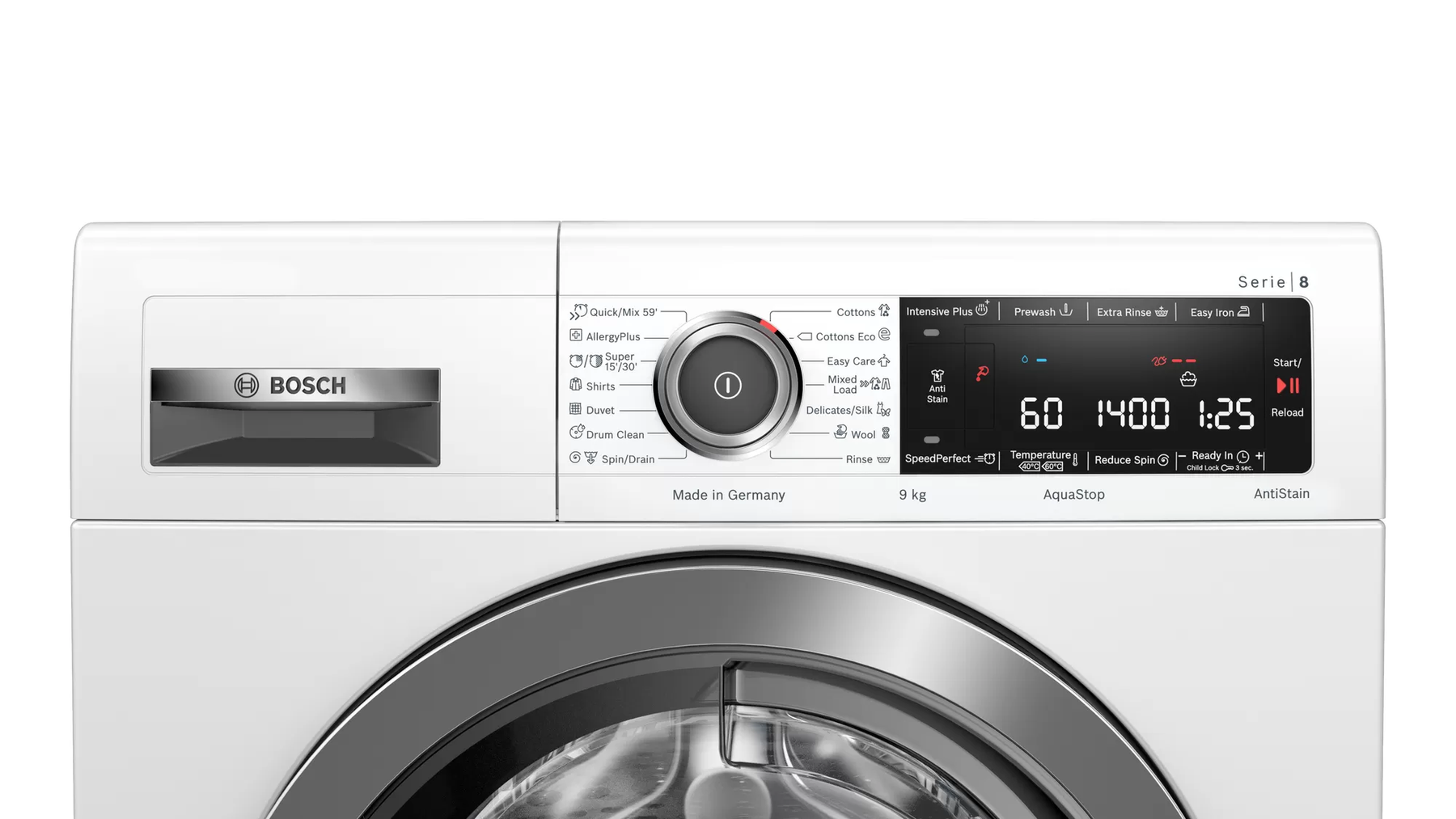 غسالة بوش 9 كيلو 1400 لفة بالدقيقة AntiStain: يزيل البقع الأربعة الأكثر شيوعًا. EcoSilence Drive™: موفر للطاقة للغاية وهادئ في... اقرأ المزيد